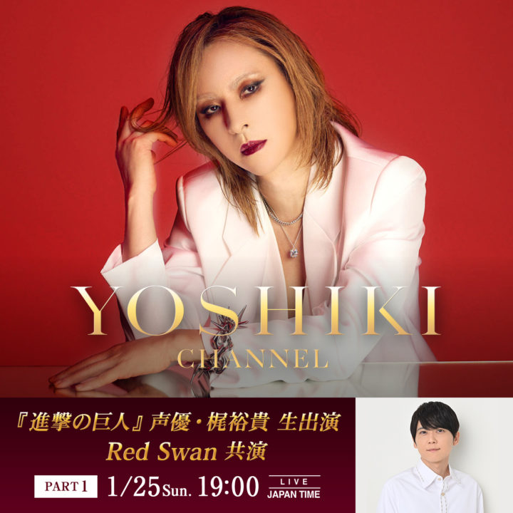 日本時間1月25日(日)19:00より、YOSHIKIが米・ロサンゼルスから緊急帰国し、自身の公式配信チャンネル「YOSHIKI CHANNEL」にて、『進撃の巨人』エレン・イェーガー役で知られる声優・梶裕貴をゲストに迎え、東京都内から生対談を実施する。本配信は、ニコニコチャンネル(日本)およびYouTube Channelメンバーシップ(日本を含む全世界)にて生放送される。